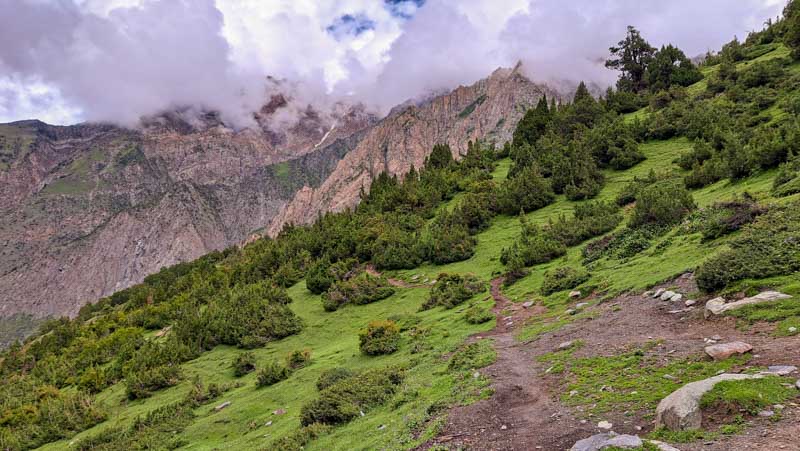 Pero fue una maravilla de ascenso, a pesar de que al ser mediodía el sol picaba bastante. Lo fue por las vistas durante la subida (sobre el valle, sobre las montañas de Hunza, las montañas de la primera foto) pero sobre todo por lo bien que lo pasé con Hussein, el cuidador y cocinero y Adnan, su primo. Dos chavales del pueblo que, en verano, trabajan allí.