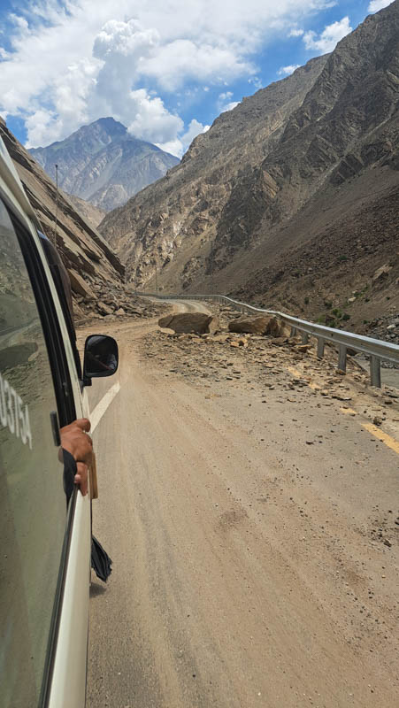 Pero también por el estado de las carreteras: comidas a la montaña, sufren constantes desprendimientos de rocas, tierra y agua, dañando el asfalto (cuando lo hay) y salpicando de obstáculos el camino. Por si fuera poco, operarios reparan sin casi señalizar las carreteras. Viajar en furgoneta aquí recuerda a un videojuego en el que tienes que ir esquivando obstáculos para llegar sano y salvo al destino final.