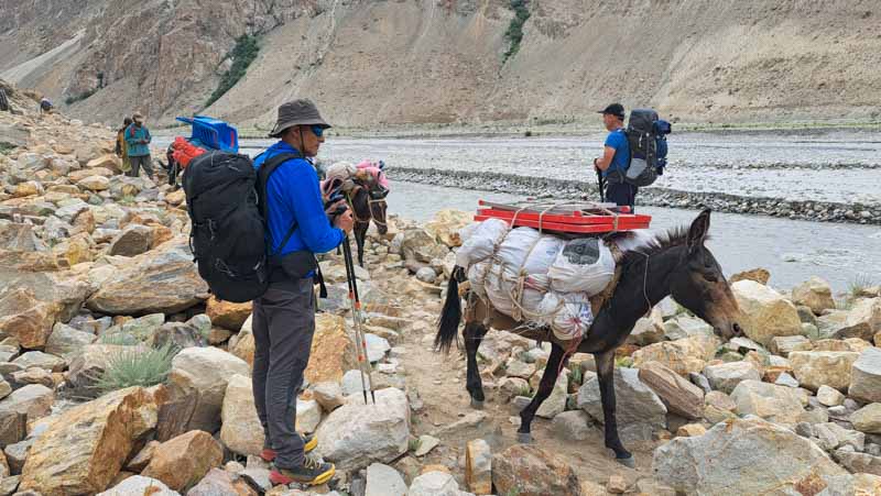Apenas nos cruzamos con nadie, los pueblos quedaron atrás y tan solo los porteadores o arrieros con sus mulas subían o bajaban aquel camino. Y helicópteros militares, que llevaban provisiones para los militares acampados al final del valle y bajaban pudientes escaladores con pocas ganas de caminar hasta el inicio de su caminata. Ni rastro de otros grupos de senderistas, que habían paralizado sus itinerarios por el mismo motivo religioso que nosotros.