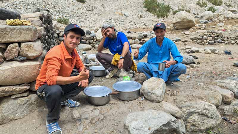 Lo precario también afecta su alimentación: de cenar, como nos explicaron y vimos, comen cuatro panes que cocinan en una plancha de leña, acompañando tazas de té balti, elaborado con leche y mantequilla. Algo conmovedor tras cargar 25 kg durante todo un día…