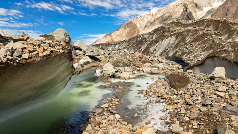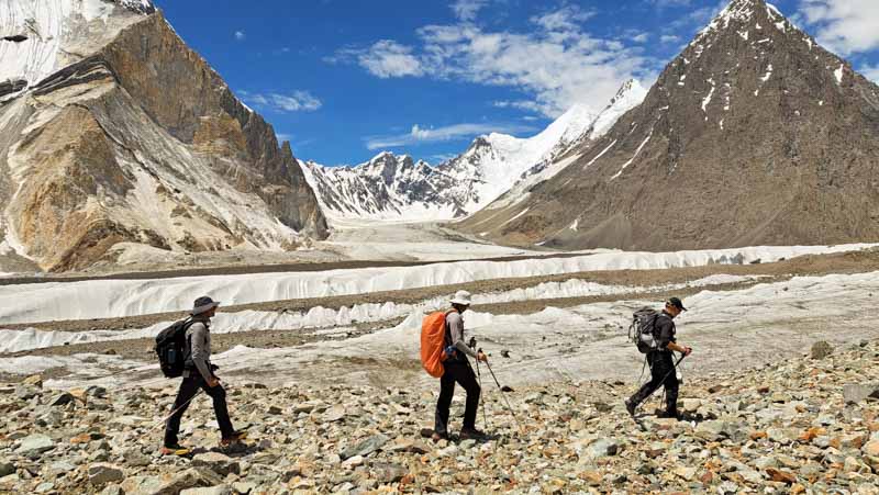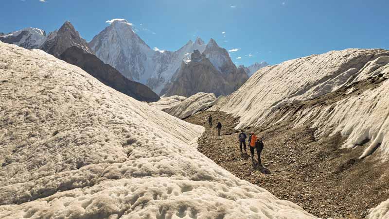 Pero lo dicho: se nos hizo pesado, eso a pesar del paisaje sobrecogedor: a nuestra izquierda alucinamos con los colores del Marble Peak (6.256 metros) y el glaciar Khal Khal descendiendo del Skil Brum (7.410). A nuestra derecha el descomunal Broad Peak (8.051 m) y el Gashebrum IV (7.932 m) con sendos glaciares vomitando hielo sobre el glaciar central del Baltoro.