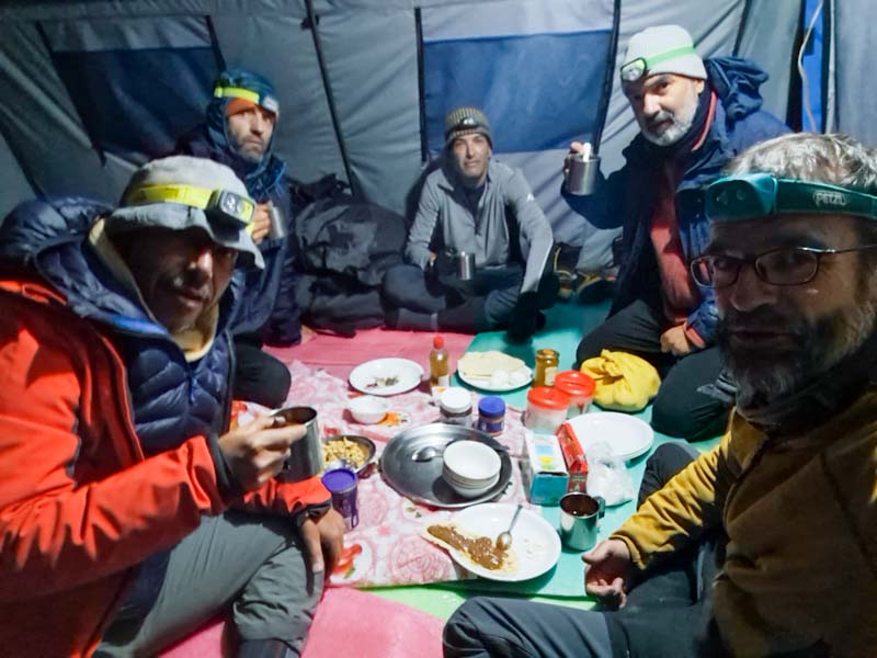 Con esa pregunta en mente comimos y nos pasamos toda la tarde en la tienda comedor, pues la nieve no nos permitió hacer nada. Cenamos pronto, a las 5, y justo después nos echamos a dormir, mucho antes de lo habitual: en apenas unas horas, a las 11 de la noche, empezaríamos la etapa reina, el paso del Gondogoro La, a 5.600 metros de altitud. Debíamos dormir algo, aunque fueran 3 o 4 horas…