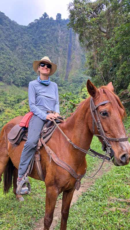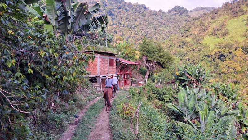 Uno de los días lo pasamos entero a caballo, ascendiendo por bosques, cultivos y fincas agrícolas (café, plátano y el invasor aguacate que tanto daño está haciendo, secando las tierras). El objetivo eran dos enormes y remotas cascadas.