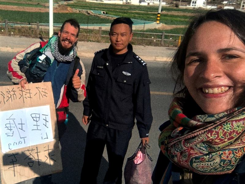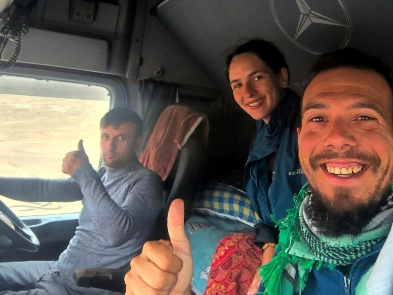 - En Tayikistán, pasaron cinco horas sin que ningún coche los recogiera. Finalmente, un camionero los salvó y les permitió viajar en su camión hacia China, donde compartieron, ni más ni menos, que tres días de viaje con él… sin poder comunicarse mucho.